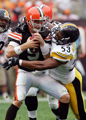 Wimbley has been scrutinized by Reboot several times in the past As It Stands Now - Outside Linebacker, as he has not developed the NFL caliber skills required of a pass rushing OLB. His lack of development has really hurt the team, as a 3-4 defense that can't rush the passer is repeatedly victimized by strong passing games. As for the others, the jury is still out on Thomas, Quinn and Wright. Thomas is solid, if unspectacular, at left tackle, while Wright's confidence currently outweighs his skills. Finally, it's probably senseless to comment on Quinn, as he likely has played his last down in Cleveland.